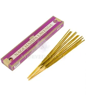 Ароматические палочки "НагЧампа и Лаванда" серии "масала", изготовлены вручную на основе бамбуковой лучины с древесным наполнителем, смешанного со смолой Чампы и ароматическим маслом Лаванды. Получаемый таким образом аромат устраняет последствия стресса, уменьшая агрессию и головные боли, нормализует сон. Прекрасно подходит для проведения сеанса релаксирующего массажа. Ароматизизирует помещение даже без возжигания: открытая пачка благовоний пропитывает помещение приятным ароматом. Без синтетических ароматизаторов.