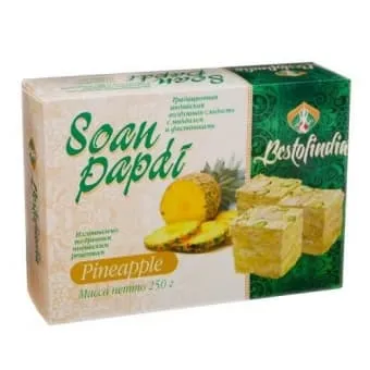 Соан Папди - это уникальное лакомство родом из сказочной Индии, изготовленное особым способом по древнем рецептам. Благодаря своей воздушной консистенции, оно буквально тает во рту, даря непередаваемые вкусовые ощущения. Ананас,миндаль и фисташки придают этим сладостям особый вкус, который не оставляет равнодушными поклонников орехов.
