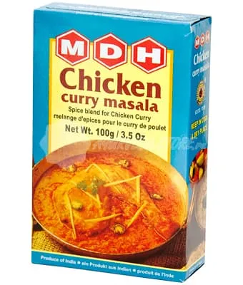 Рецепт курицы карри: Возьмите цыплёнка весом примерно 1 кг и разрежьте на 8 частей. Порежьте 3 луковицы и обжарьте в 100 граммах растительного масла. Добавьте 3 помидора, 1/2 столовой ложки красного перца. Хорошо перемешайте, затем добавьте 1 чайную ложку (15 г) приправы MDH Chicken Curry. Помешивая, добавьте курицу и готовьте в течение 10 минут. Добавьте 100 мл йогурта, 60 мл воды, уменьшите огонь, накройте крышкой и тушите ещё 20 минут. Перед подачей на стол добавьте 15 мл лимонного сока и немного листьев пажитника, перемешайте.