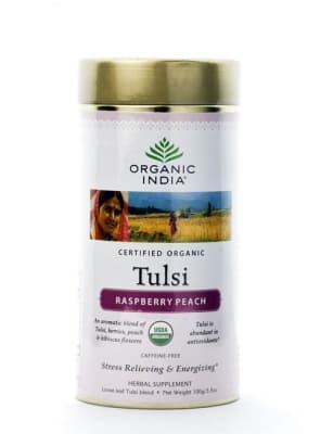 Аюрведический базиликовый чай с малиной и персиком выводит токсины, не содержит кофеин.